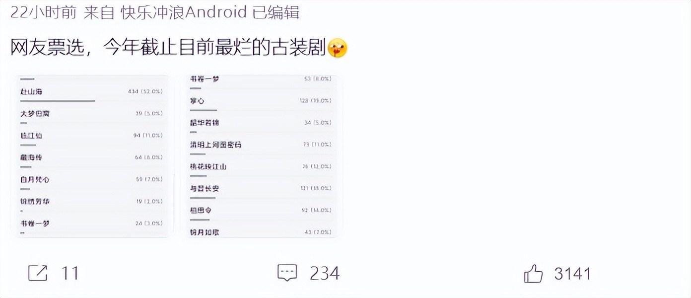 看到《山河枕》的成绩,很多网友都想到丁禹兮和杨超越主演的《七时吉祥》,这部剧播出的时候,取得的数据不理想,但这部剧的讨论热度却非常高,所以吐槽声音也大,而《山河枕》播出后,网友们根本没有吐槽,因为大部分网友都没有看这部剧。