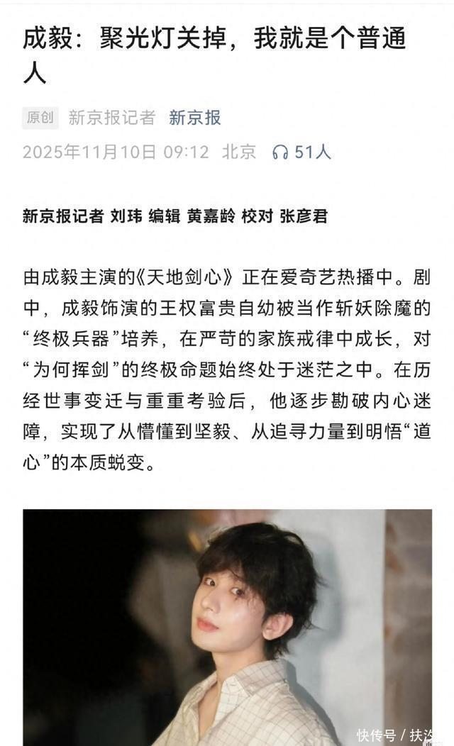 戏外的成毅更显真实通透。他直言“聚光灯关掉,我就是个普通人”,透露自己享受独处时光,能在安静中汲取思考的力量。对于拍打戏的艰辛,他归因于“艺德”与热爱,坦言希望通过武侠作品向观众尤其是青少年传递“侠义精神”,在他们心中种下勇气与担当的种子。从《莲花楼》到《天地剑心》,他饰演的角色常带坚韧与纯粹,而这份特质也延伸到他的职业态度中——“只想把眼前的戏拍好”,这份近乎“轴”的认真,正是粉丝始终追随的核心原因。