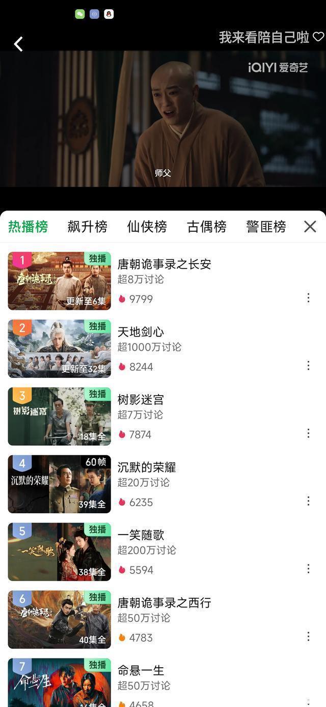 10月末各平台接连上来几部大制作古装剧,开播前都是奔着爆款去的,但播出后的成绩实在是说不上有多好,几部大男主剧的播放量都相差不大。 成毅、李一桐主演的《天地剑心》还大结局呢,猕猴桃就赶紧把《唐朝诡事录之长安》抬了出来。首播6集,热度居然直接反超《天地剑心》。不仅是飙升榜第1,还是热度榜第1,首播当日热度就达到了8800。赶超了上个月《天地剑心》创造的首播记录,创下爱奇艺电视剧首日站内热度历史纪录,远超第一季和第二季的升温速度。